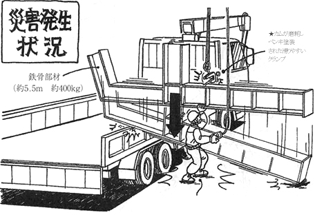 運転者が「クレーン作業の操作は不慣れで急旋回」をしたこと。 玉掛け者はつり荷に介添えロープを取り付けなかったこと。
