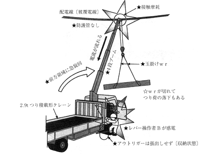 4段ブームの積載形クレーンが転倒して高圧配電線に接触